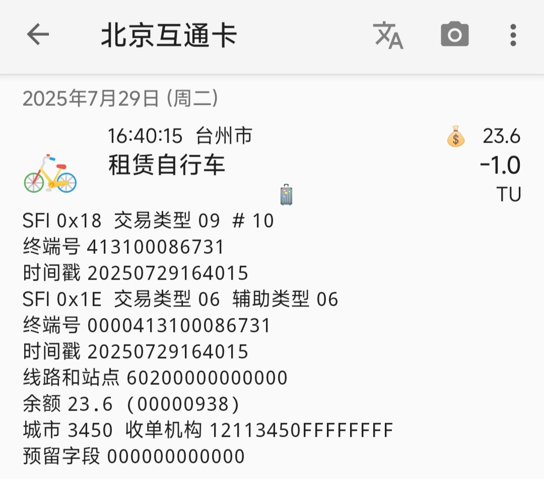 | Description | 温岭公交亿达刷卡机将交易类型错写为租赁自行车,图中刷卡线路20路。温岭市所有TU都是写租赁自行车。 | ||||