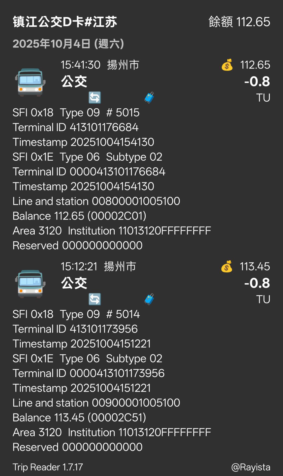 | Description | 仪征市原加载南京智汇(仪征市民卡)韧体的渤海化学FJZ型刷卡机已于2025年10月1日起改为加载扬州市民卡的韧体,刷卡机线路号写法有区别,没有换乘优惠。前三位写入线路号(10进制),公司号5100为仪征市。如图为8路和9路。 | ||||