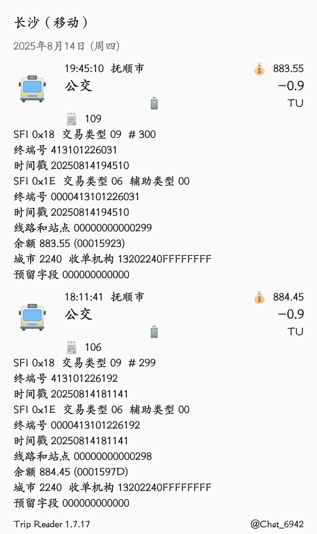 抚顺公交自2025年中以来陆续更换郑州天迈TM6158卡机,所写1E文件「线路和站点」位仅有递增序号,无实用信息。