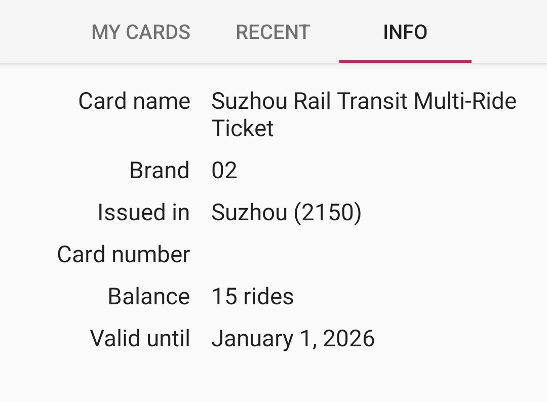 | Description | 建议增加允许此类型卡片的存储到MyCards。卡片基本信息、余额、交易信息均可读。 另外,卡片交易车站在苏州地铁的自助机上可显示站名,不知道是不是暂时没有decode?谢谢 | ||||