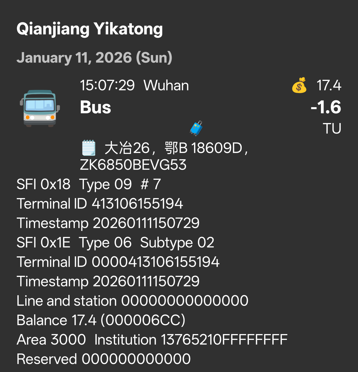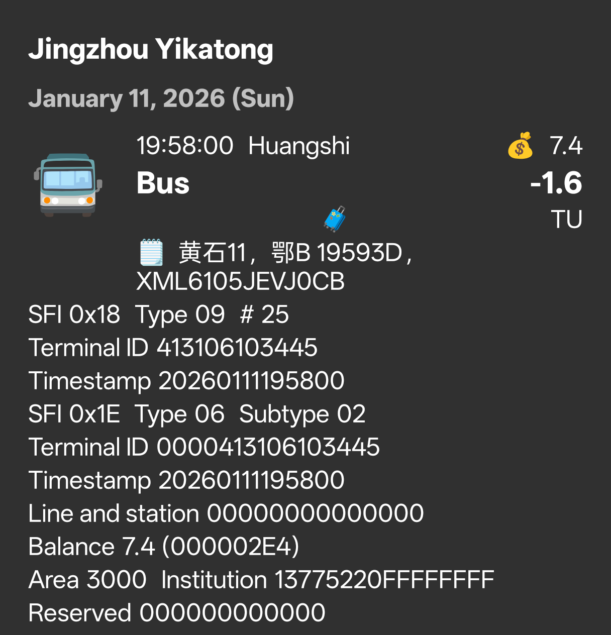 | Description | 黄石公交既然目前是卡机地区写武汉,按照收单机构识别,那大冶公交这个号段也可以同样写上地区而不是写武汉,当然不同公司区分的问题嘛,省事就都对应黄石完事了,反正比写武汉强。 只不过这两个公司都不写路号,真想区分的话可以仿照大连的旅顺公交的写法那样,直接读取到收单机构就写个XX公交得了。 | ||||