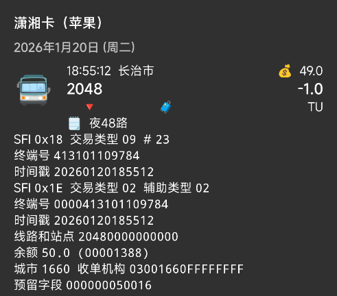 | Description | 长治公交“夜48”路刷卡机线路号为2048 | ||||