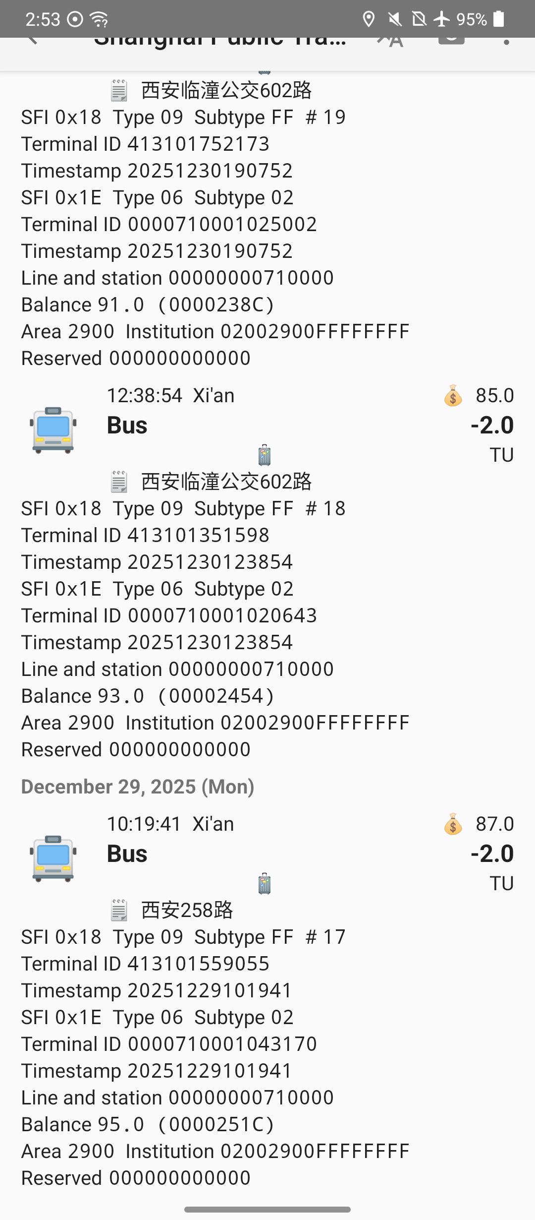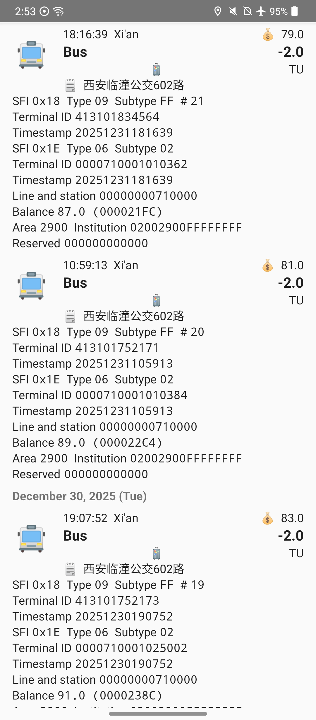 | Description | 我的上海卡在西安刷走的是TU,但是记录只显示Bus,以下为app内截图,望作者帮忙诊断一下,谢谢。 | ||||