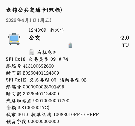 | Description | 南京麒麟有轨电车站点换装南京通用卡机刷卡,目前线路号固定显示9001,行业代码0017,调整展示🚋有轨电车 | ||||