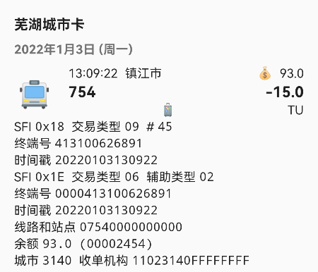 | Description | 已确认该线路号对应:镇江江天集团的镇扬城际公交。(扬镇旅游专线/镇扬城际公交,为扬州扬汽快客与镇江江天汽运合营,扬州方习惯性称扬镇旅游专线,镇江方习惯性称镇扬城际公交。)线路号是镇江公交向镇江江天提供的专用于该线路的线路卡对应的线路号参数。 | ||||