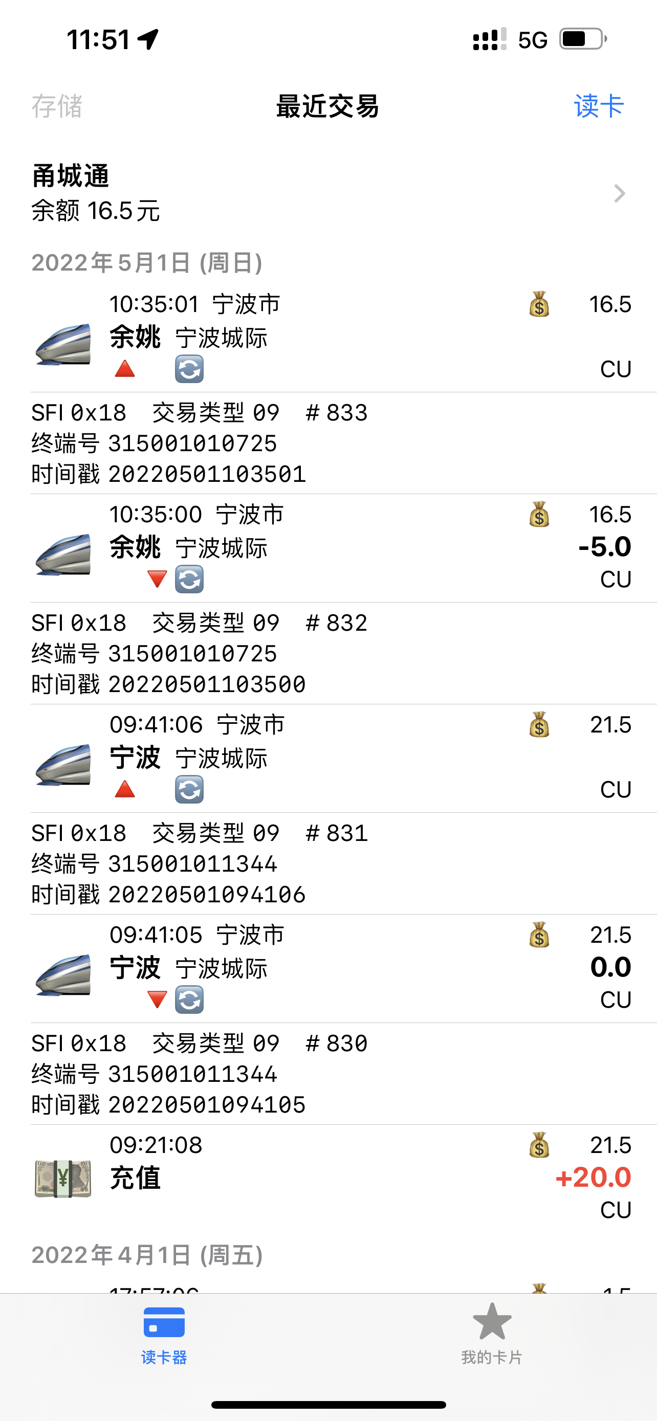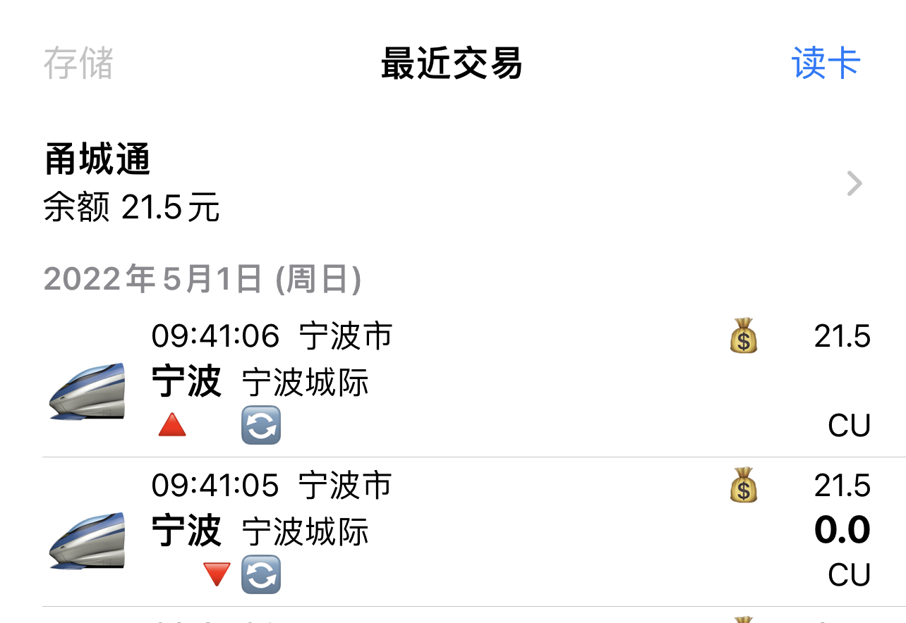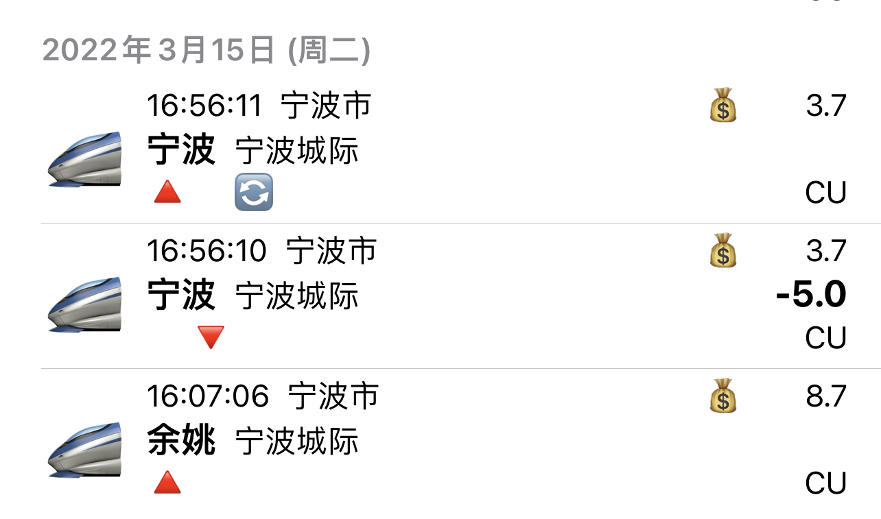 | Description | 在宁波城际铁路闸机刷CU甬城通,部分闸机在进出站时会写两条记录,时间差为1秒。建议可将重复记录隐藏(1秒内) | ||||