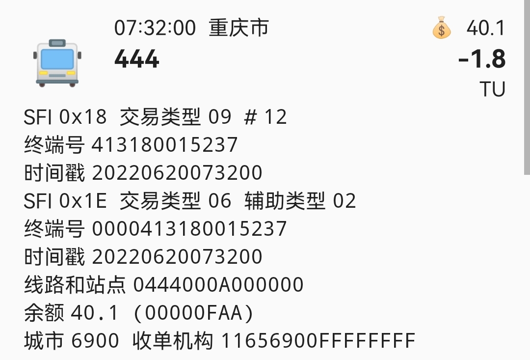 | Description | 在乘坐重庆公交BRT01路时,刷卡后读卡时会显示为444路 | ||||