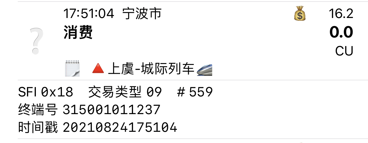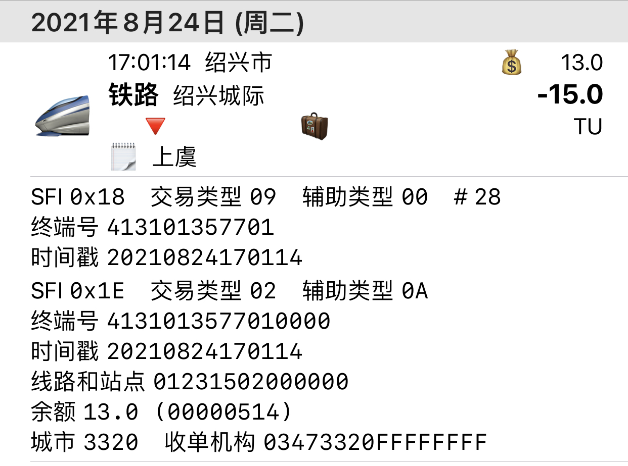 | Description | 绍兴城际列车上虞站1E文件线路站点号(前四位)0123,第5-6位1A表示进站,15表示出站,第7-8位为闸机位置,后六位为0 | ||||