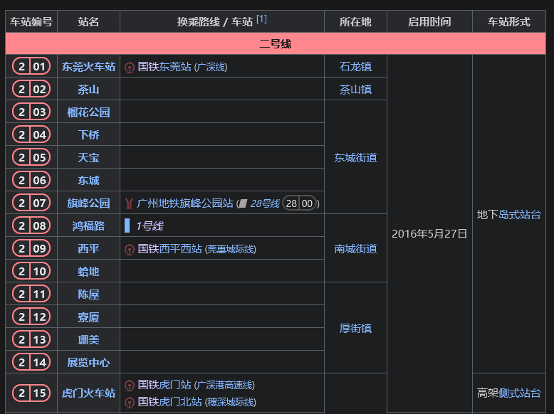 City,Code,Type,Line,Station 6020,0002,地铁,2号线, 6020,00020201,地铁,2号线,东莞火车站 6020,00020202,地铁,2号线,茶山 6020,00020203,地铁,2号线,榴花公园 6020,00020204,地铁,2号线,下桥 6020,00020205,地铁,2号线,天宝 6020,00020206,地铁,2号线,东城 6020,00020207,地铁,2号线,旗峰公园 6020,00020208,地铁,2号线,鸿福路 6020,00020209,地铁,2号线,西平 6020,00020210,地铁,2号线,蛤地 6020,00020211,地铁,2号线,陈屋 6020,00020212,地铁,2号线,寮厦 6020,00020213,地铁,2号线,珊美 6020,00020214,地铁,2号线,展览中心 6020,00020215,地铁,2号线,虎门火车站 | ||||