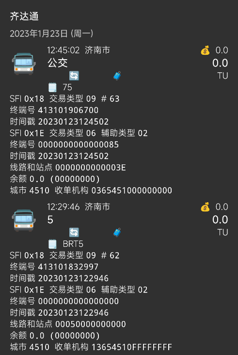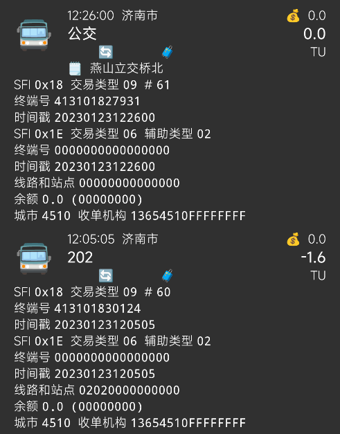 另外1.7.8版本加入了对济南换乘优惠的卡类判别,卡类01以外无法显示🈹,济南公交早期发行的交通部非互通卡卡类为00,请作者适配 |