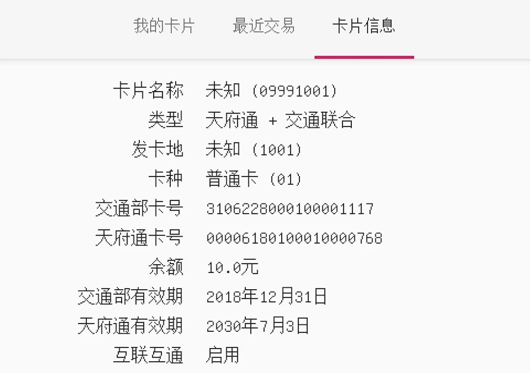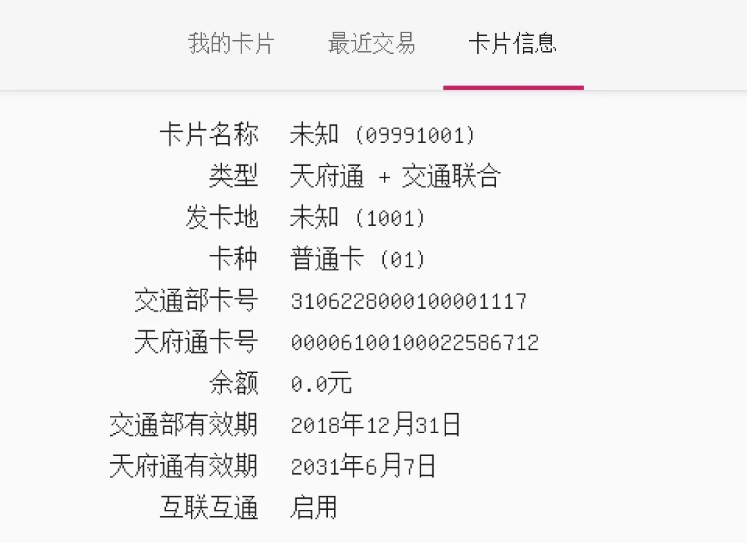 | Description | 目前 天府通部分本地卡为 双标准卡 交通部标准为过期测试号段 该号段全部统一为(3106228000100001117)+天府通标准卡片 在使用时仅能使用天府通标准 建议优先在保存时优先保存天府通标准号段。 特别的 | ||||