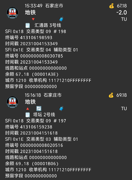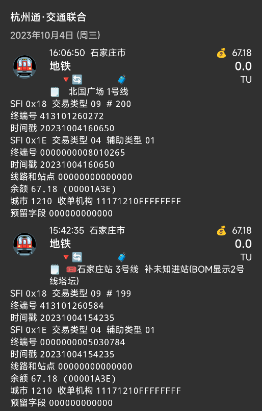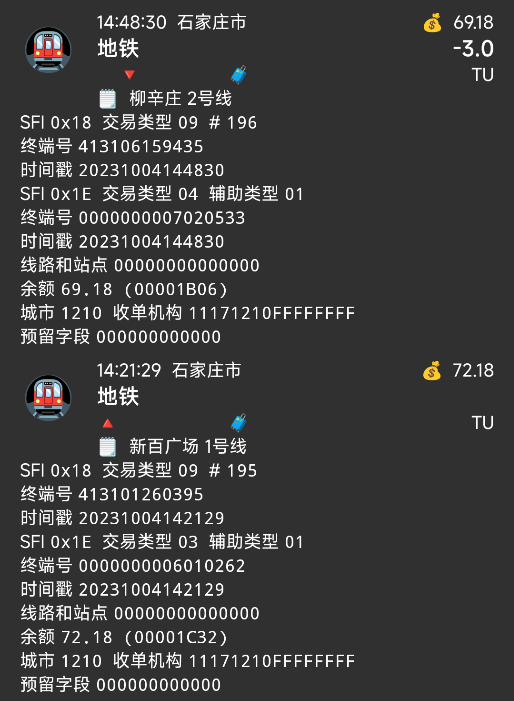 | Description | 石家庄地铁1E写卡混乱,线路号位于1E终端号第11位第12位,站点暂时无法识别,站点号非常乱,且毫无任何规律。 | ||||