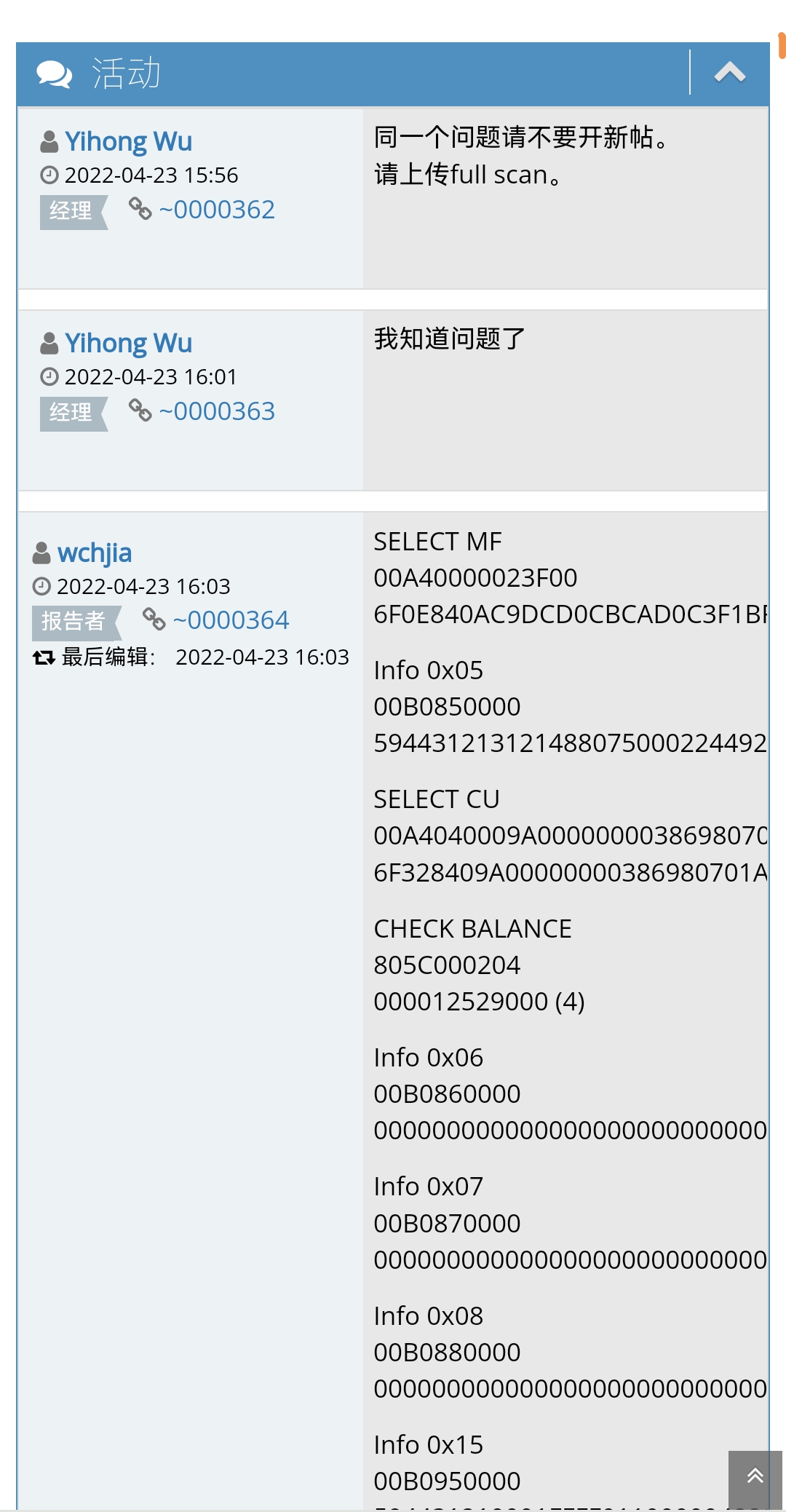 | Description | 根据问题0000229里面的截图可知,这是在安卓版本下读卡识途的截图,但我怎么找不到full scan这个功能选项啊。 | ||||