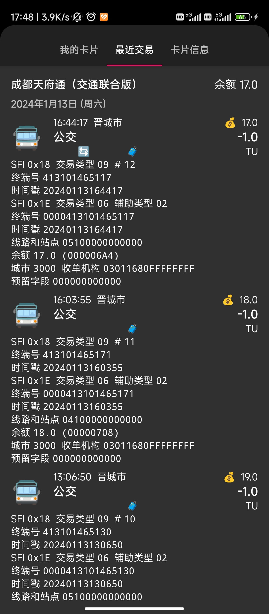 | Steps To Reproduce | 在晋城公交刷任意一张异地交通联合卡,用读卡识途读取即可发现 | ||||