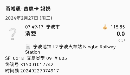 建议之后CU为315001的统一判断为宁波地铁,具体站点的闸机数据有待测试,需测试数据较多。 |