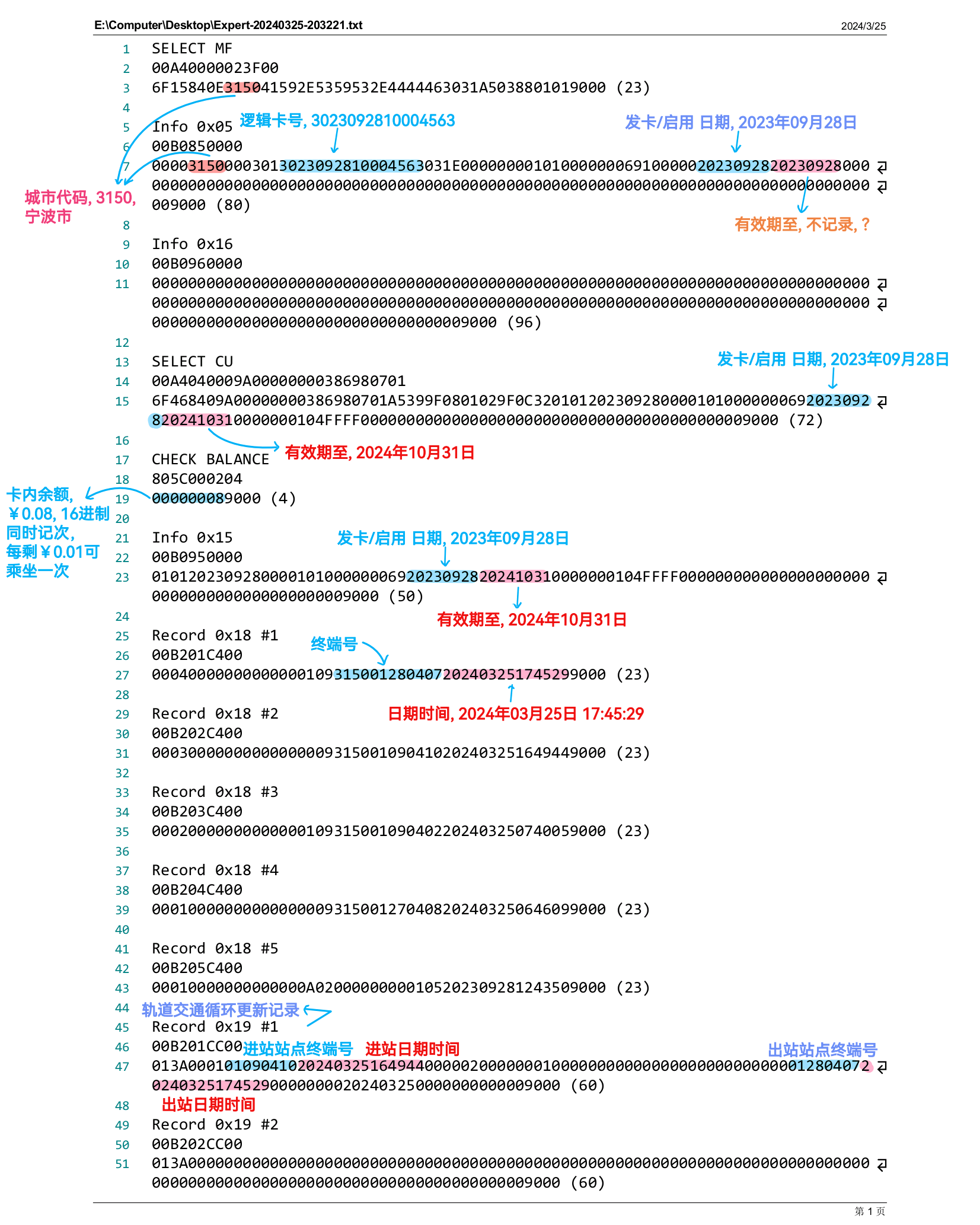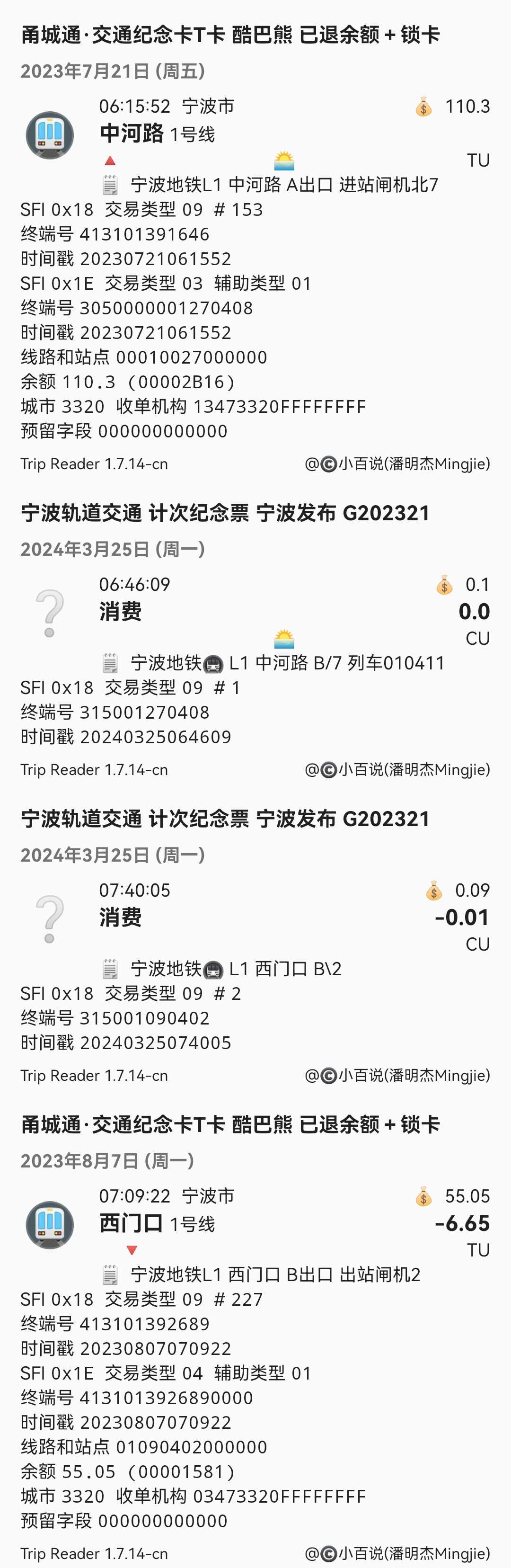 感谢宁波轨道交通站点的工作人员的协助,我也知道了他们的机器所能读取到全部的数据,根据这些数据,试图在Full scan 数据中找到。 |