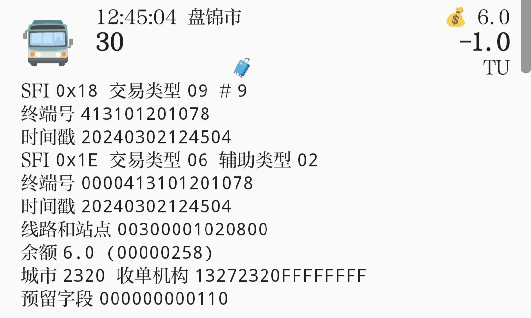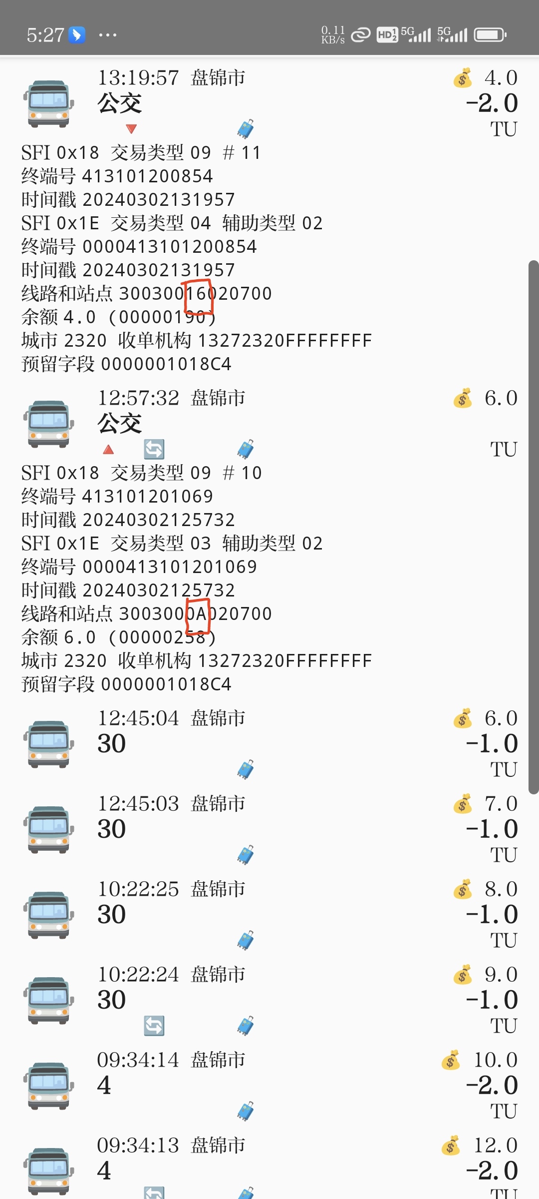 | Description | T1,2,3从小键盘输入金额的刷一次卡,改为前后门上下车刷卡,读卡后发现不显示T1,2,3了,因为线路和站点信息中包含站点信息(截图中红框)了,站点序号会发生变化,所以建议就看“线路和站点”的前四位数来判别线路,具体站点名称和站序号可以放在以后版本?(有时间我会收集的) | ||||