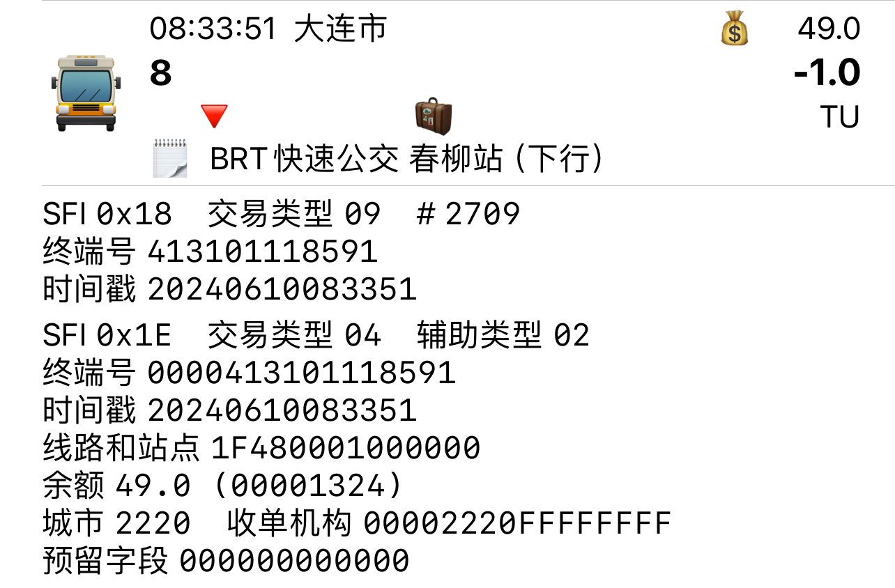 | Description | 大连公交集团线路近期更换智达卡机,写卡为16进制,数据如下: | ||||