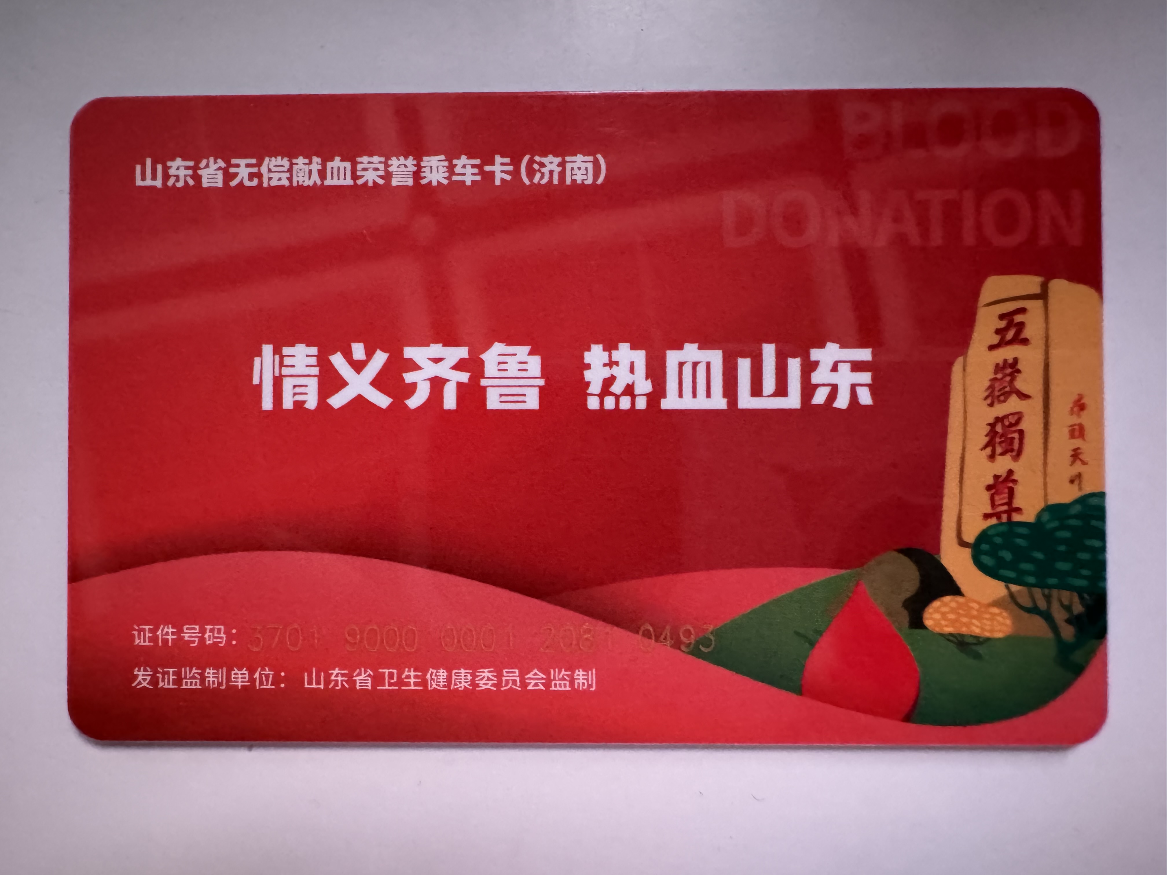 | Description | 名称为:山东省无偿献血荣誉证(济南),类型:城市一卡通,发卡地:济南市 | ||||