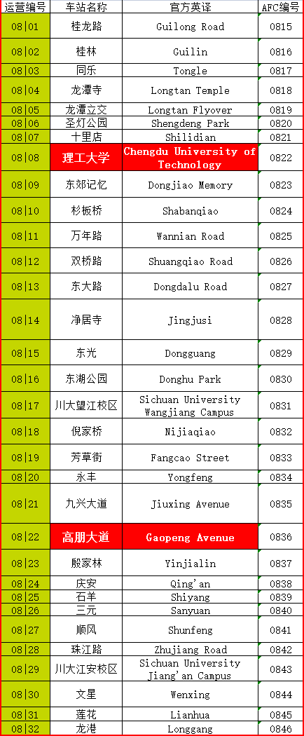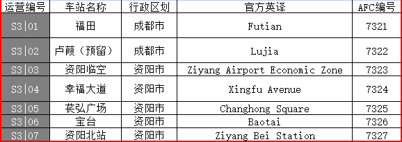 | Description | 接报告,成都轨道交通集团预计于2024年年内开通市域(郊)铁路S3资阳线、轨道交通8号线二期、27号线一期。经咨询运营公司相关AFC负责人,现将各站点站名、翻译、站点运营编号及AFC编号公布如下。 S3资阳线(Line S3): 8号线二期(Line 8): 27号线一期(Line 27): | ||||