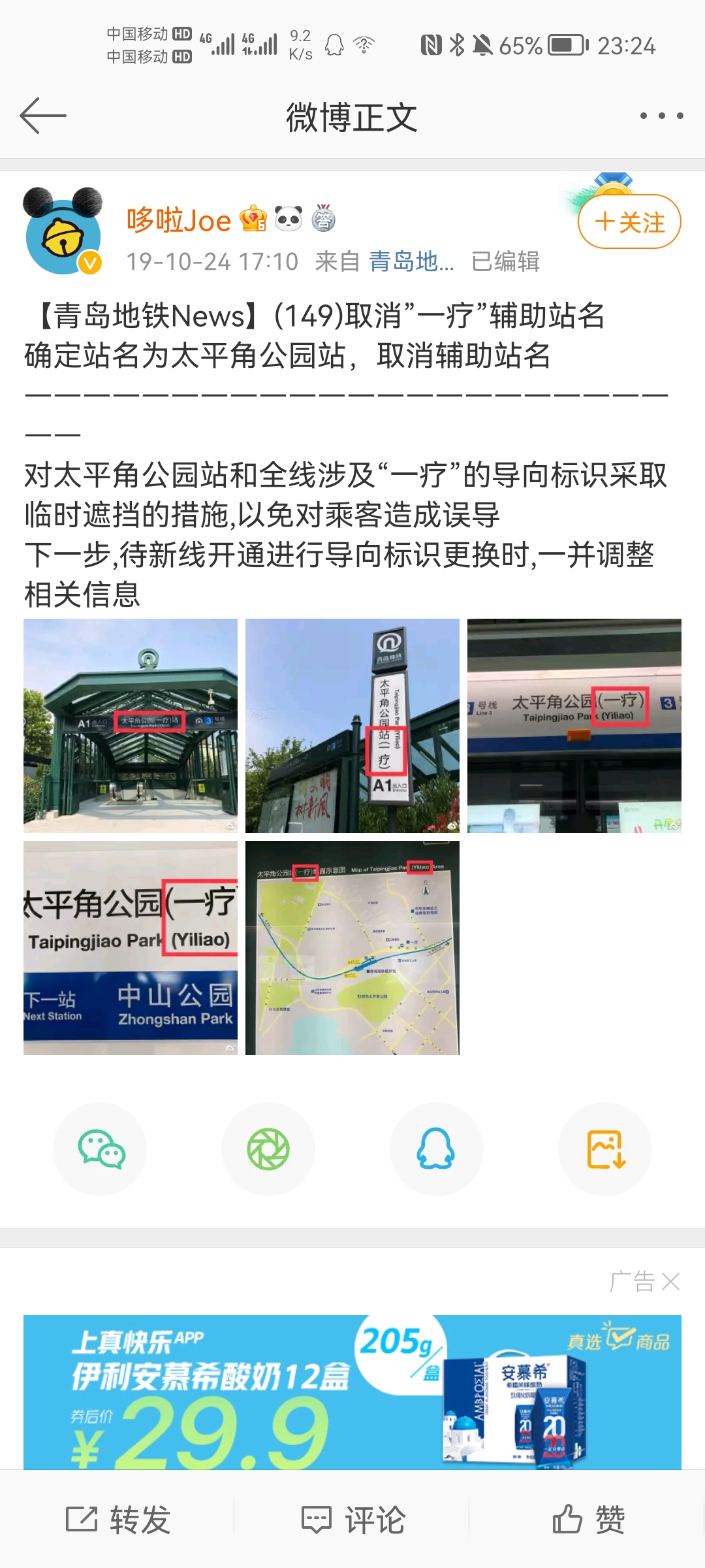 | Description | 青岛地铁3号线太平角公园站的副站名(一疗)已经取消 | ||||