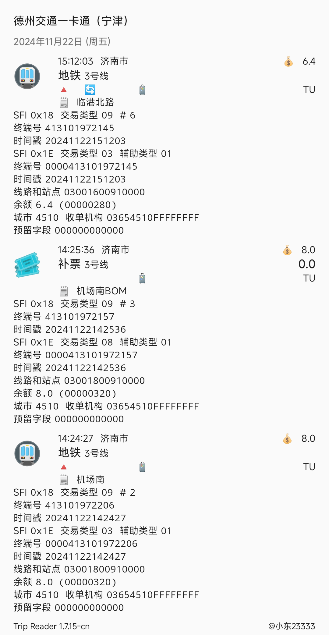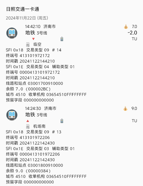 | Description | 如图,前六位代表具体站点 济南地铁3号线原030005礼耕路,本站已改名为安城街,写卡依旧为030005。 | ||||