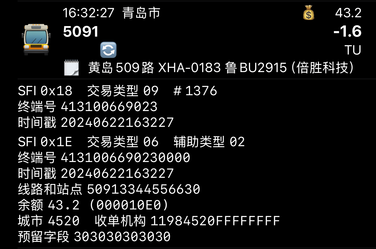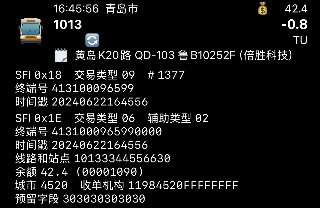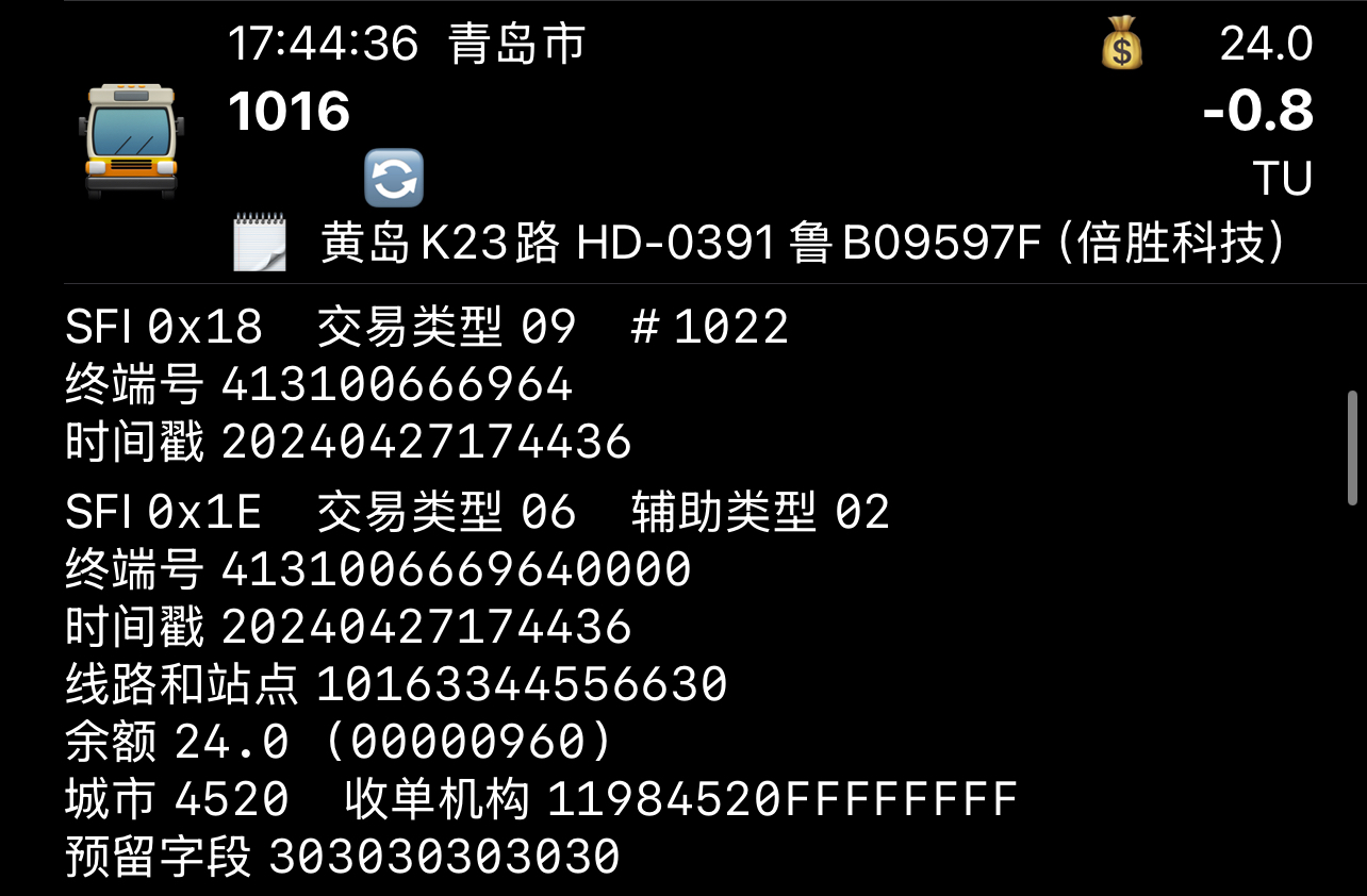 目前根据2024年度新车分配,若按照新的识别方法,部分线路号转为16进制数后为纯数字的线路可能会识别出错,例如: 琴岛通所使用的雄帝科技EMP5210卡机会在线路与站点9~12位写4520(附件图1下),而EMP5212卡机则全部写0(附件图1上) |