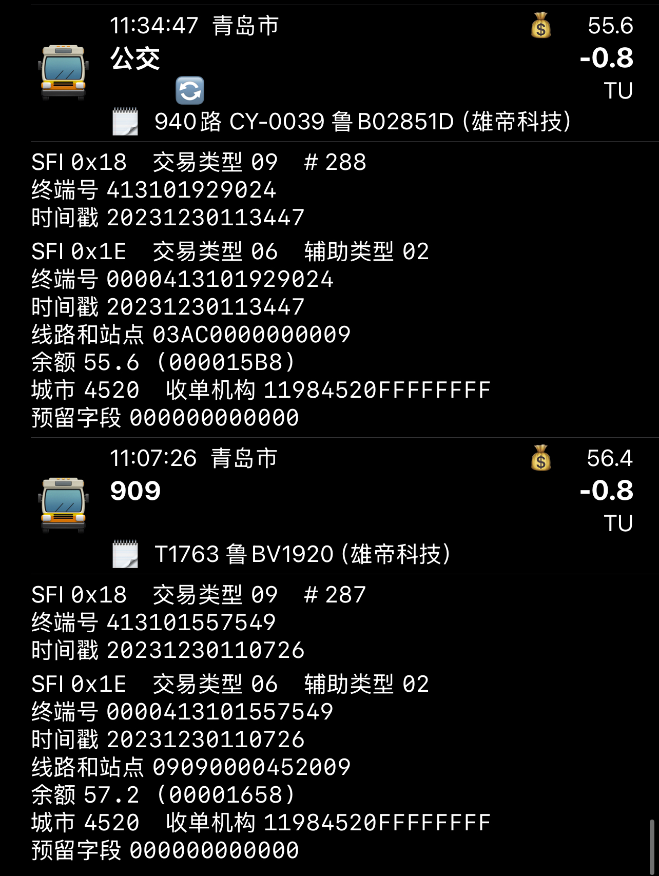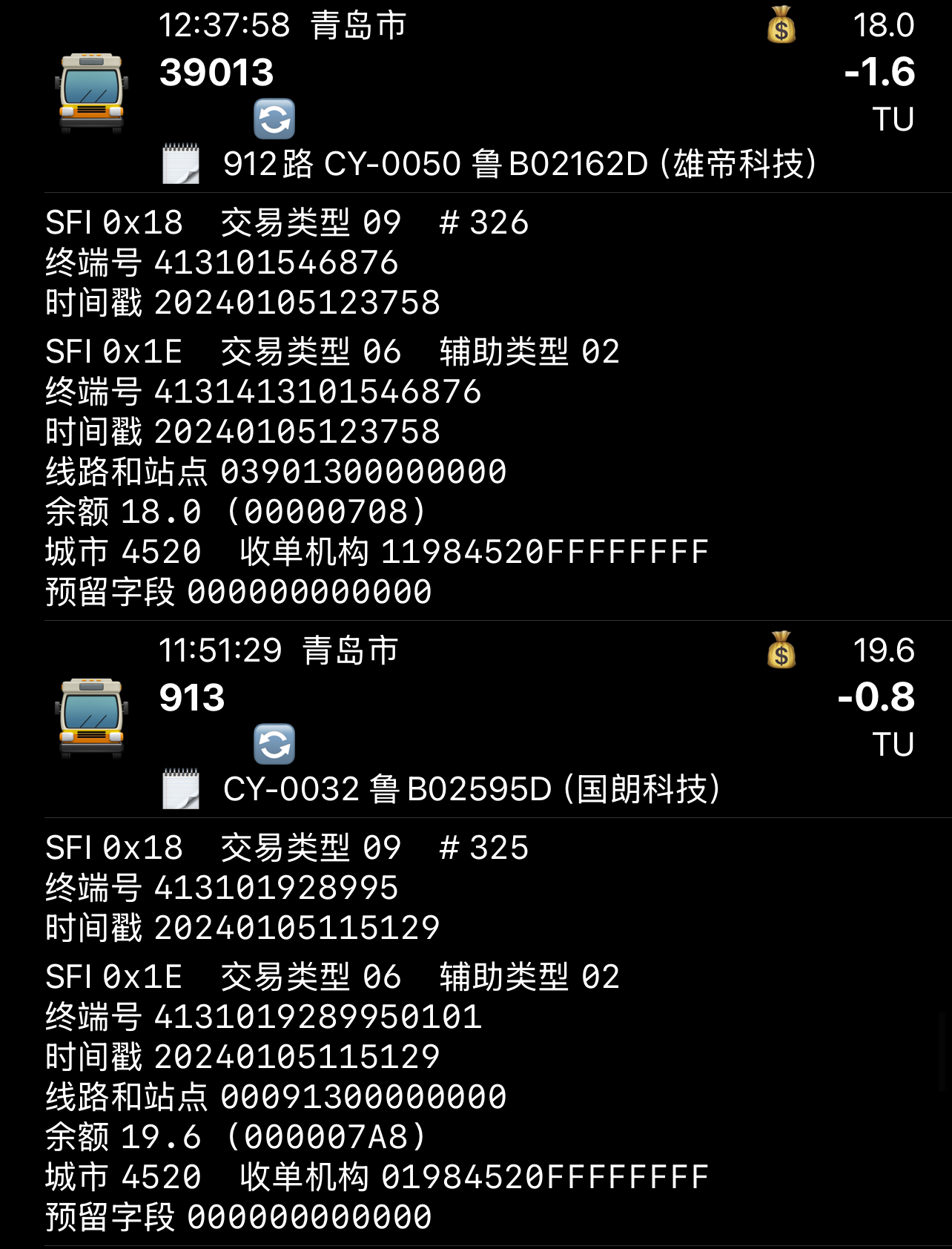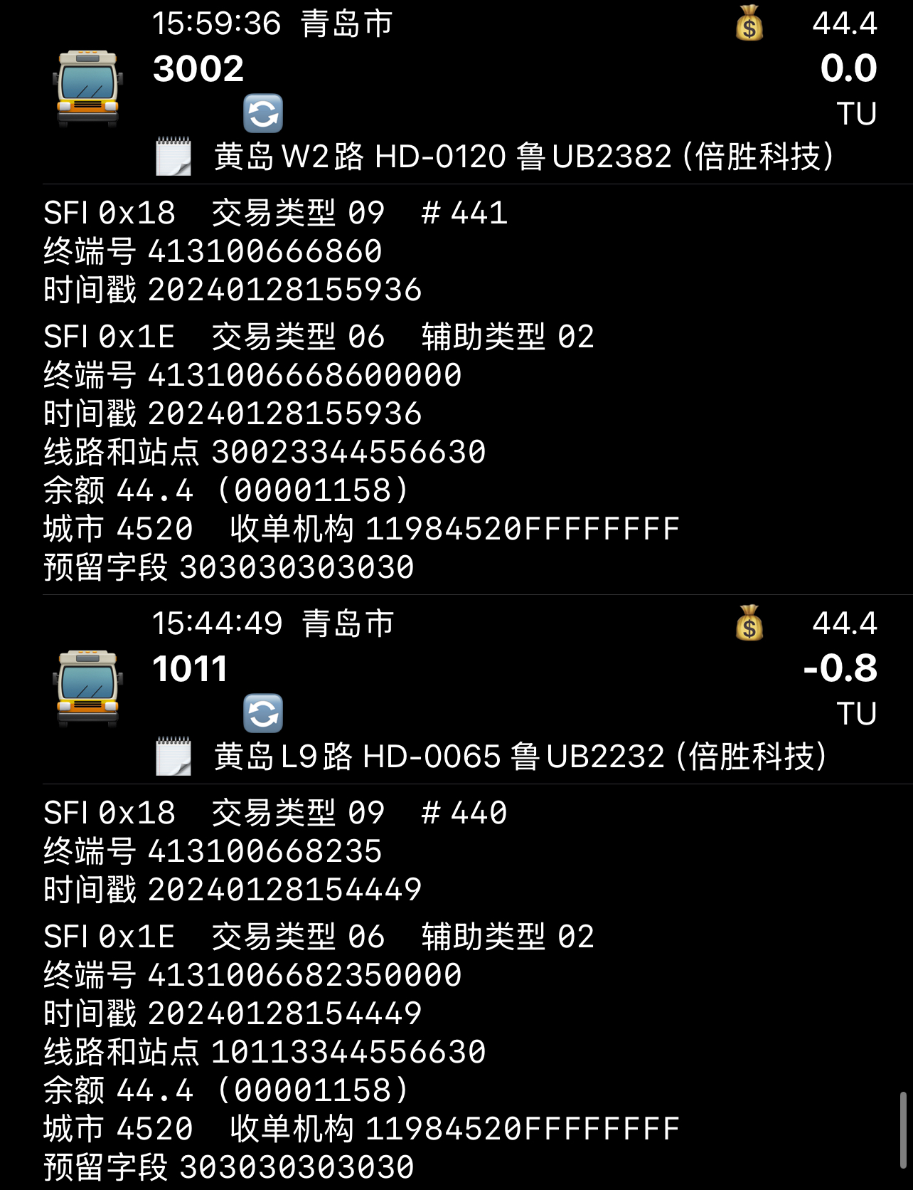 目前根据2024年度新车分配,若按照新的识别方法,部分线路号转为16进制数后为纯数字的线路可能会识别出错,例如: 琴岛通所使用的雄帝科技EMP5210卡机会在线路与站点9~12位写4520(附件图1下),而EMP5212卡机则全部写0(附件图1上) |