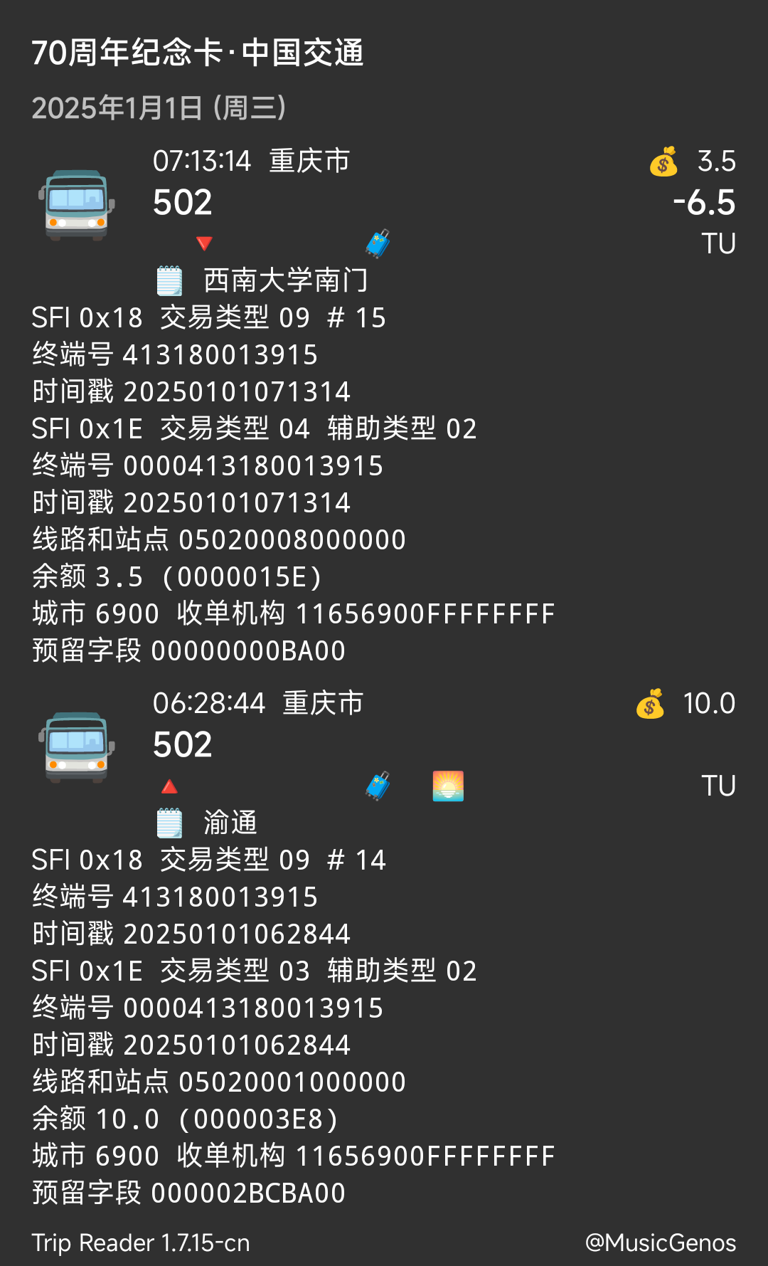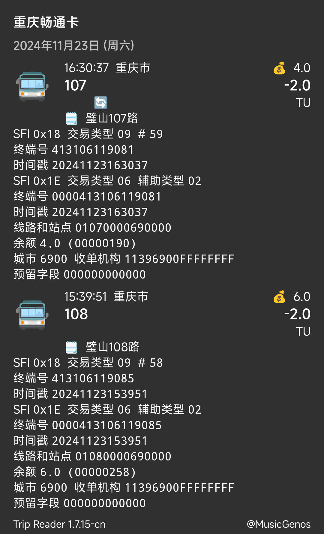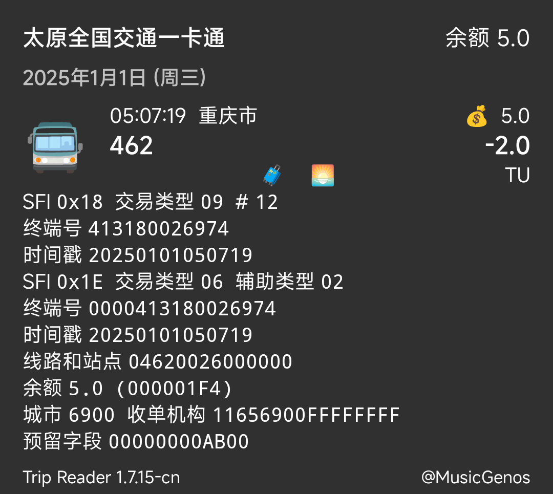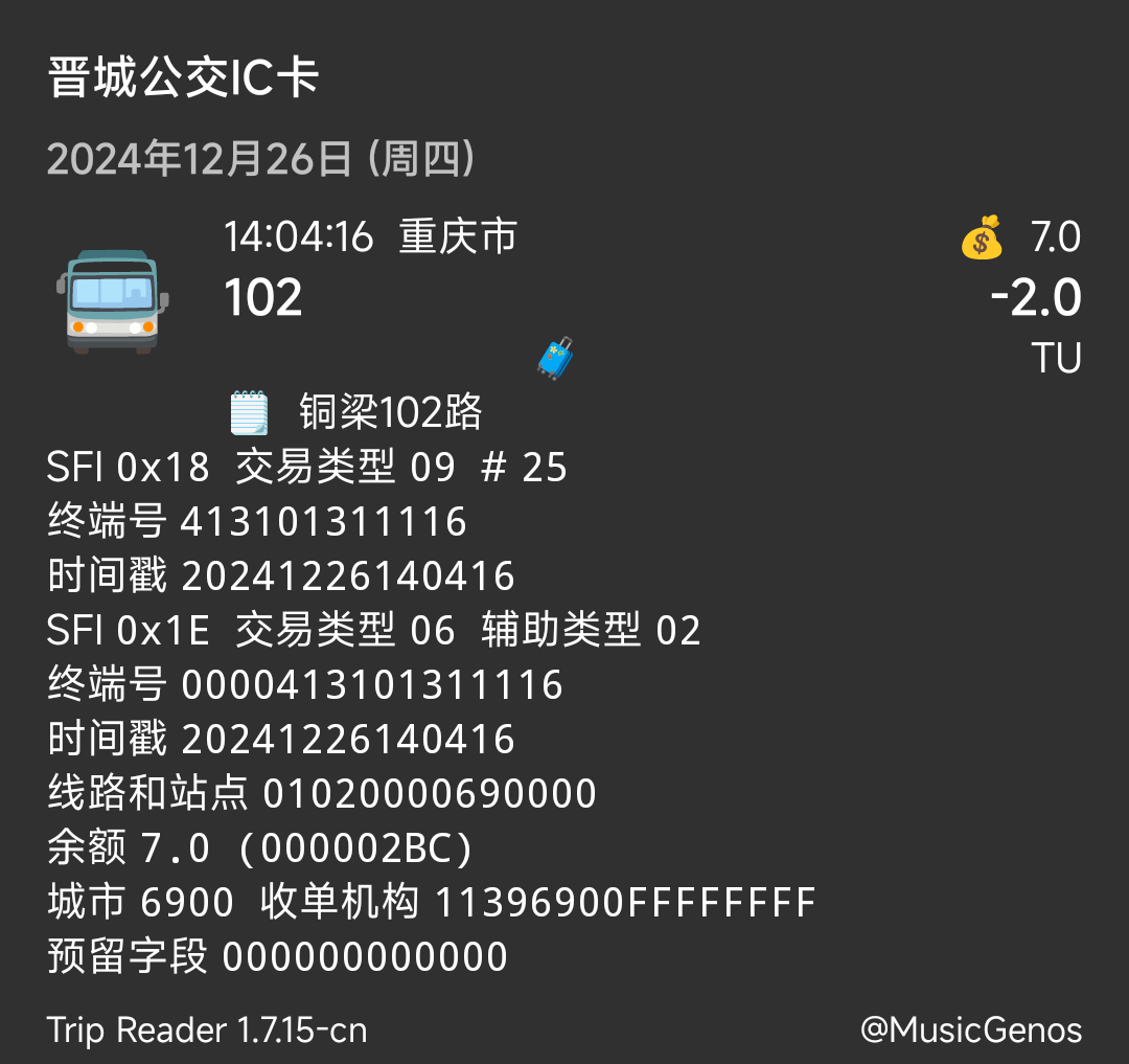 | Description | 重庆主城公交由重庆通卡收单,收单机构前4位是1165。而重庆区县公交基本都是由重庆城卡收单,收单机构前4位是1139。因此建议当交易类型是公交时,根据收单机构前4位区分主城和区县公交,并用较小的字体在线路号旁边相应地显示是重庆主城还是重庆区县。 | ||||