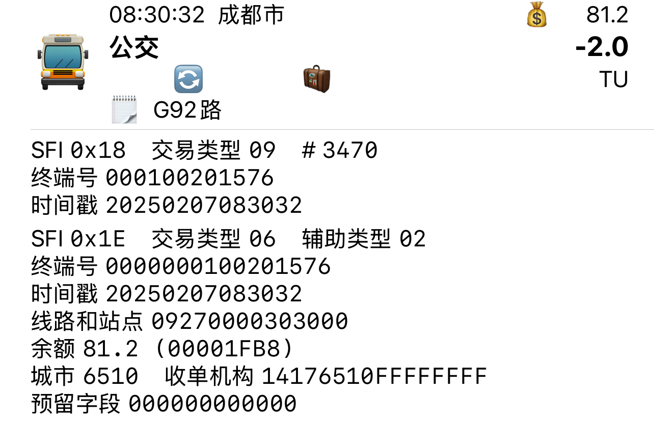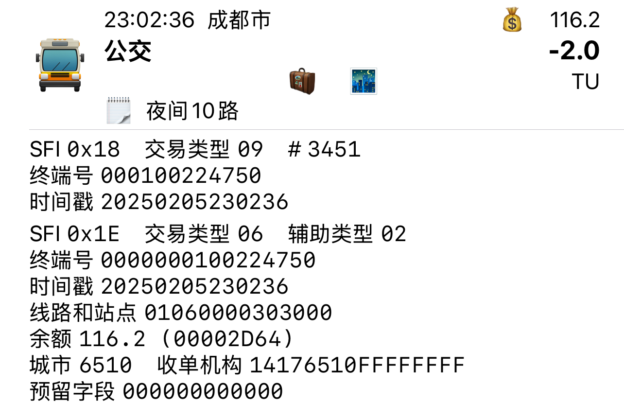 | Description | 成都公交集团线路更换蓝斯股份卡机后,在1E文件线路与站点中写入4位线路号。 根据目前测试线路,蓝斯股份卡机写法只能正常显示线路号3位及以下的线路,当线路编号为4位,最高一位将无法写入,如1022路,卡机写线路号为0220,无法正常识别;同时,集团郊区公司带字母开头的线路也可能存在识别的可能性。 因此,目前对于3位及以下线路号的常规线路、支线线路、夜间线路及高峰线路,可按照以上规则进行识别与显示。 附件为蓝斯股份卡机以及部分线路测试交易记录 | ||||