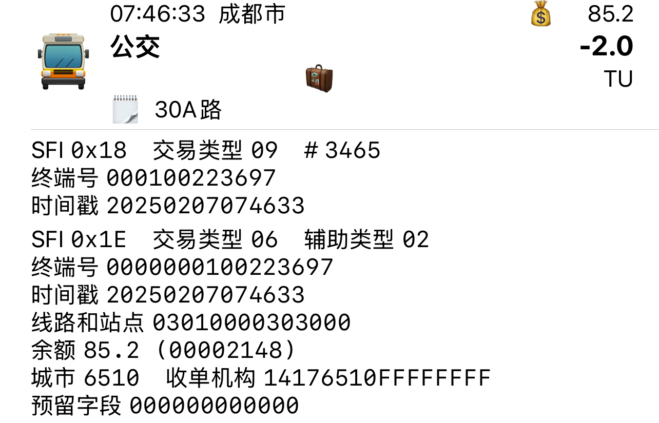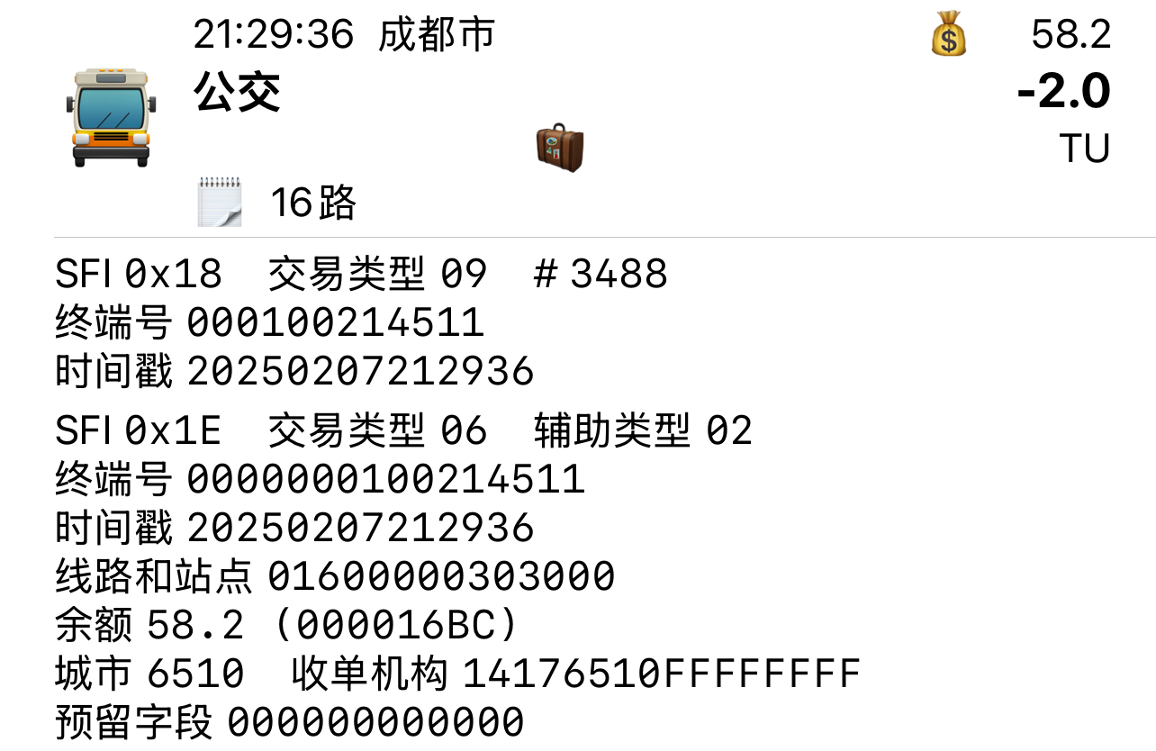 | Description | 成都公交集团线路更换蓝斯股份卡机后,在1E文件线路与站点中写入4位线路号。 根据目前测试线路,蓝斯股份卡机写法只能正常显示线路号3位及以下的线路,当线路编号为4位,最高一位将无法写入,如1022路,卡机写线路号为0220,无法正常识别;同时,集团郊区公司带字母开头的线路也可能存在识别的可能性。 因此,目前对于3位及以下线路号的常规线路、支线线路、夜间线路及高峰线路,可按照以上规则进行识别与显示。 附件为蓝斯股份卡机以及部分线路测试交易记录 | ||||