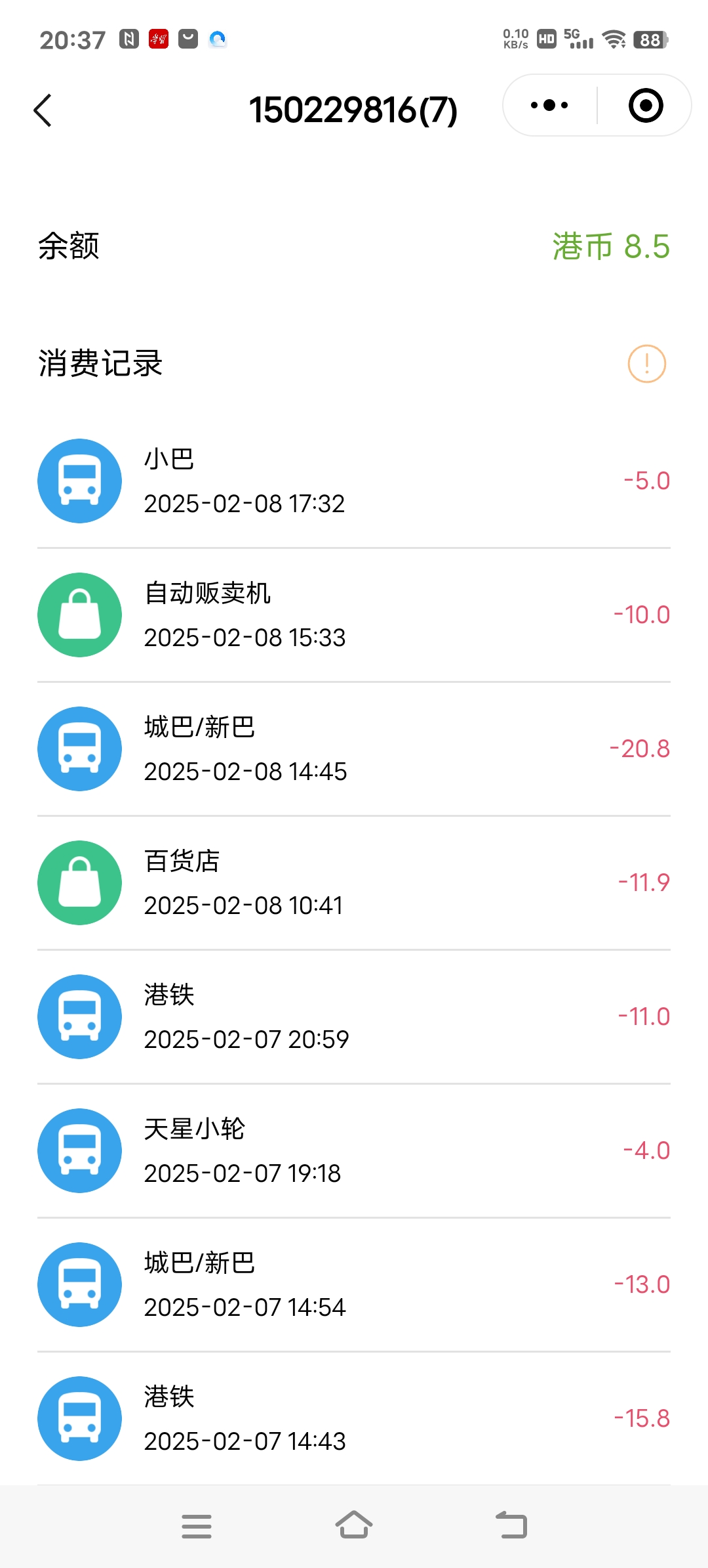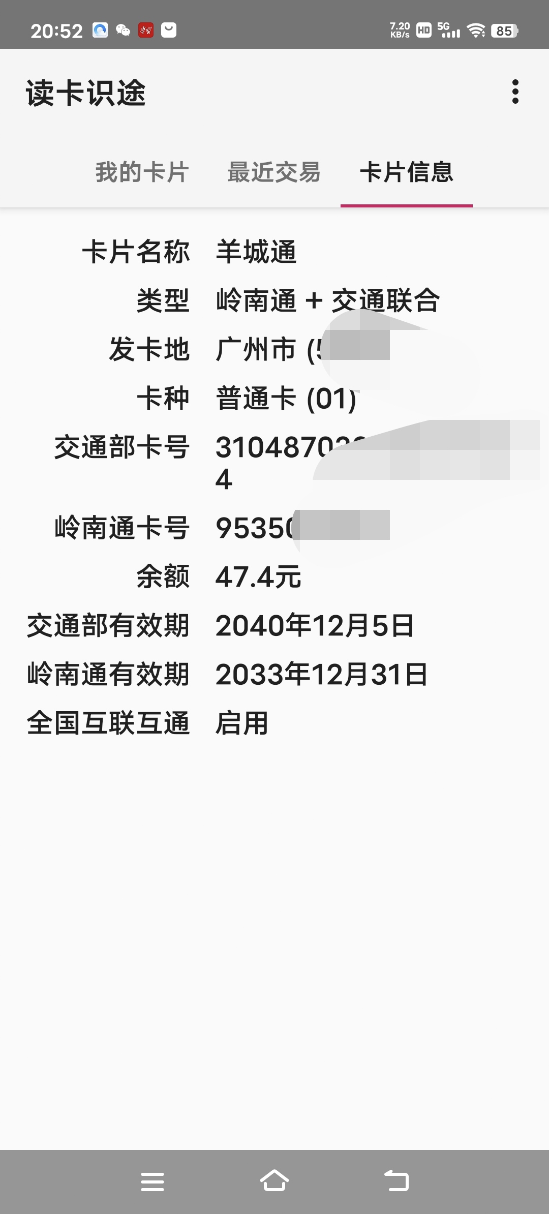 | Description | 我使用了一张“岭南通·八达通·交通联合卡”(这张卡分两个钱包)前往香港刷卡乘坐巴士港铁轮渡和自动售卖机,而使用读卡识途只能识别到我的卡的内地钱包数据,不能识别到港币钱包数据,而分别使用岭南通和八达通小程序可以读取。我不知道是卡的原因还是app,或者是我手机的原因,且不是那么重要 因此优先度低 | ||||