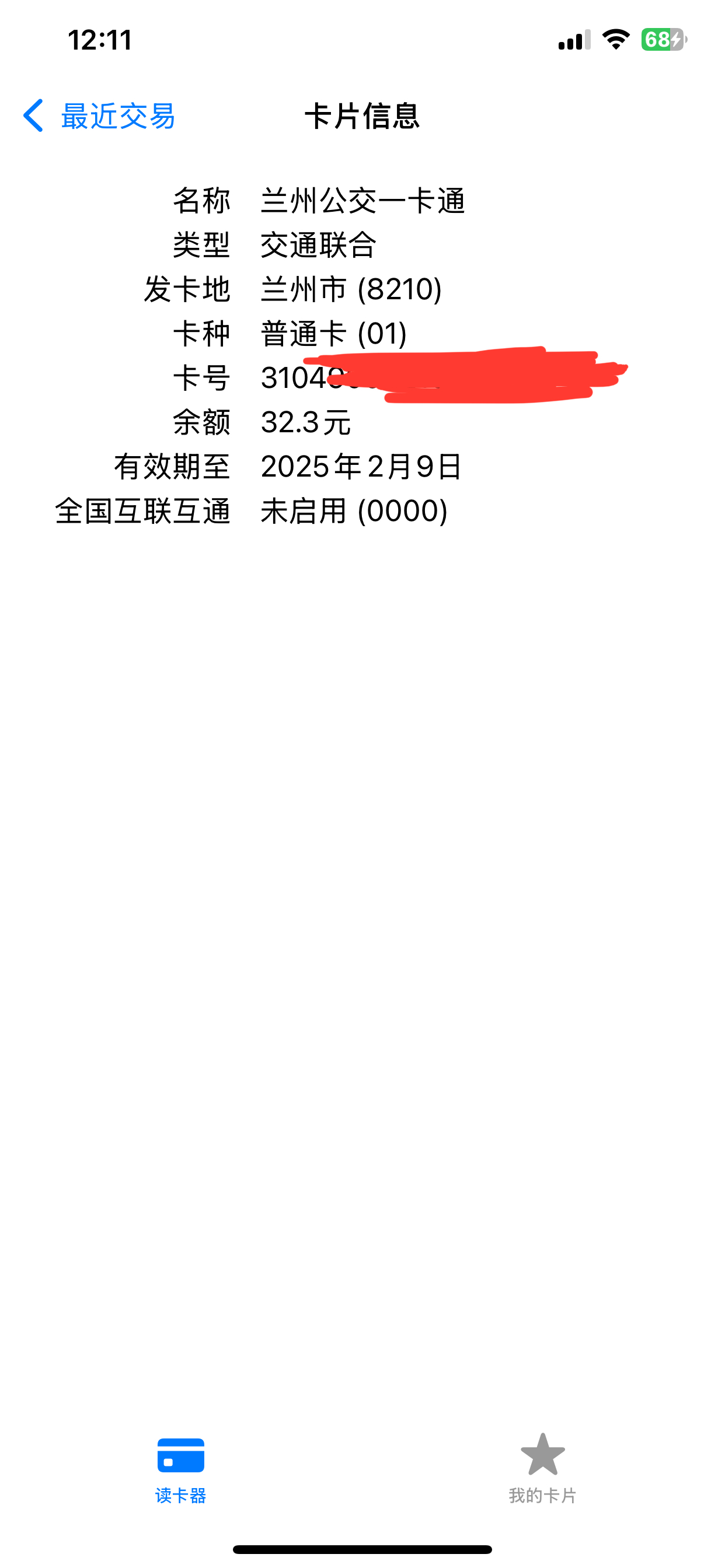| Description | 在主页读卡之后顶端会有这张卡的信息,非常实用,但是储存之后卡片只存了卡号和消费记录,没有信息,比如有效期等,要看的话要每次都刷一遍,如果在储存的卡片里也能看到信息就好了! | ||||