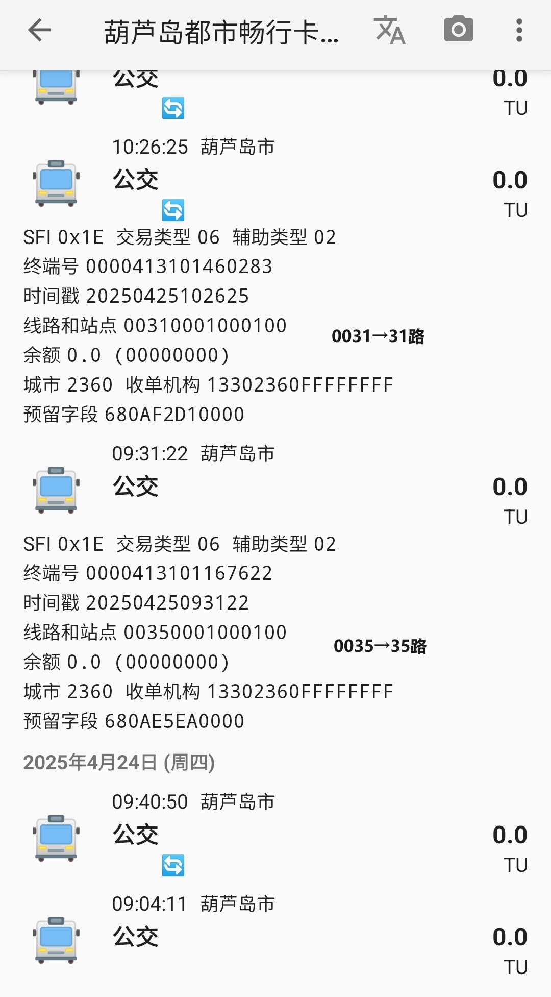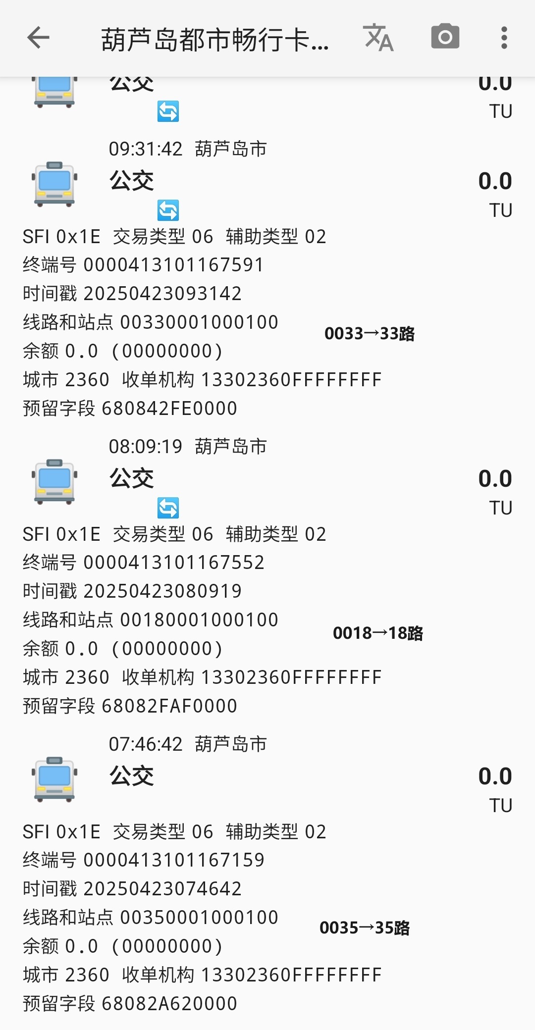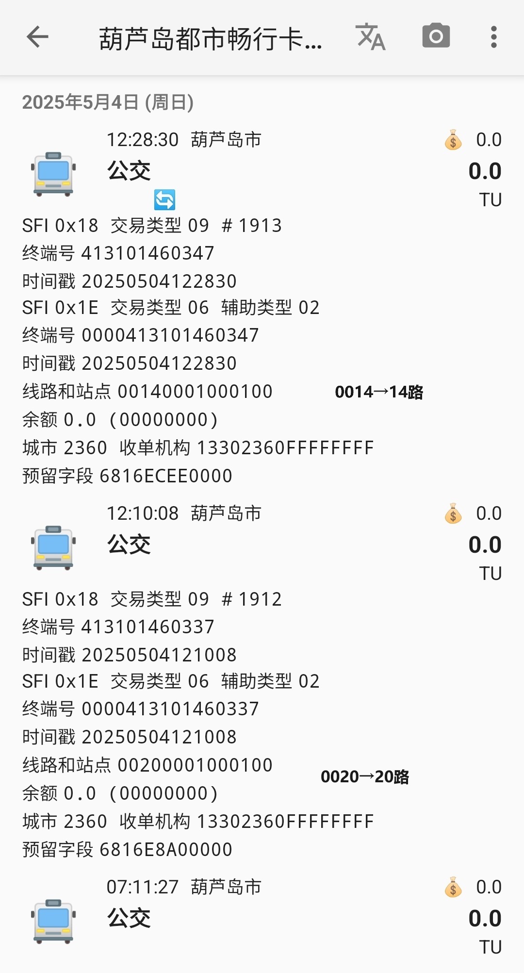 | Description | 葫芦岛公交1E前四位为路号,10进制。大部分线路为一票制上车刷卡,分段计价线路路号规则推测应一致。特殊路号线路较少,可以先直接匹配。附件图片中乘车记录作为示例。暂时没有分段计价线路和特殊路号线路的乘车记录,可待后续补充。 | ||||