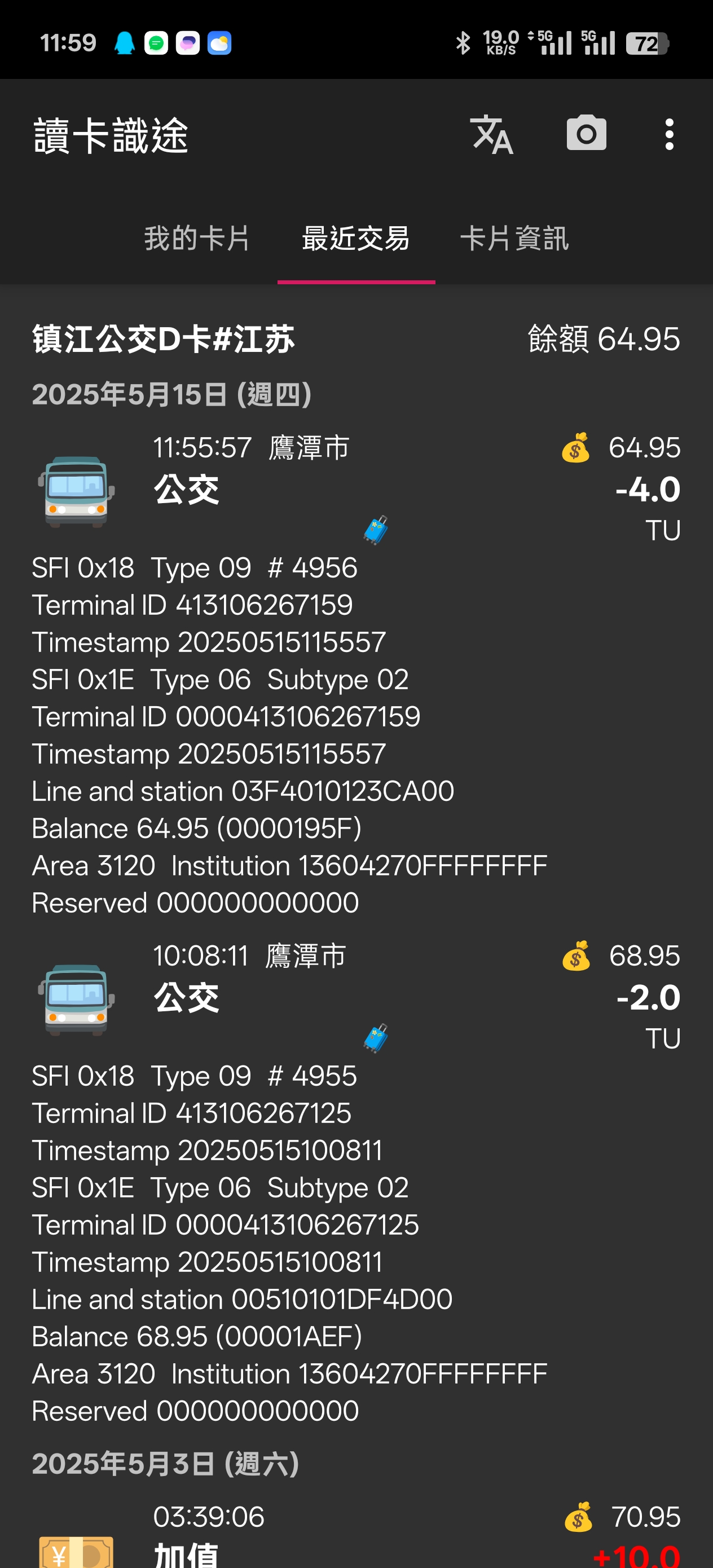 | Description | 鹰潭公交在1E中使用16进制在前四位写入线路号,转换成10进制后可直接使用。特殊线路1011=K1,1012=K2 | ||||