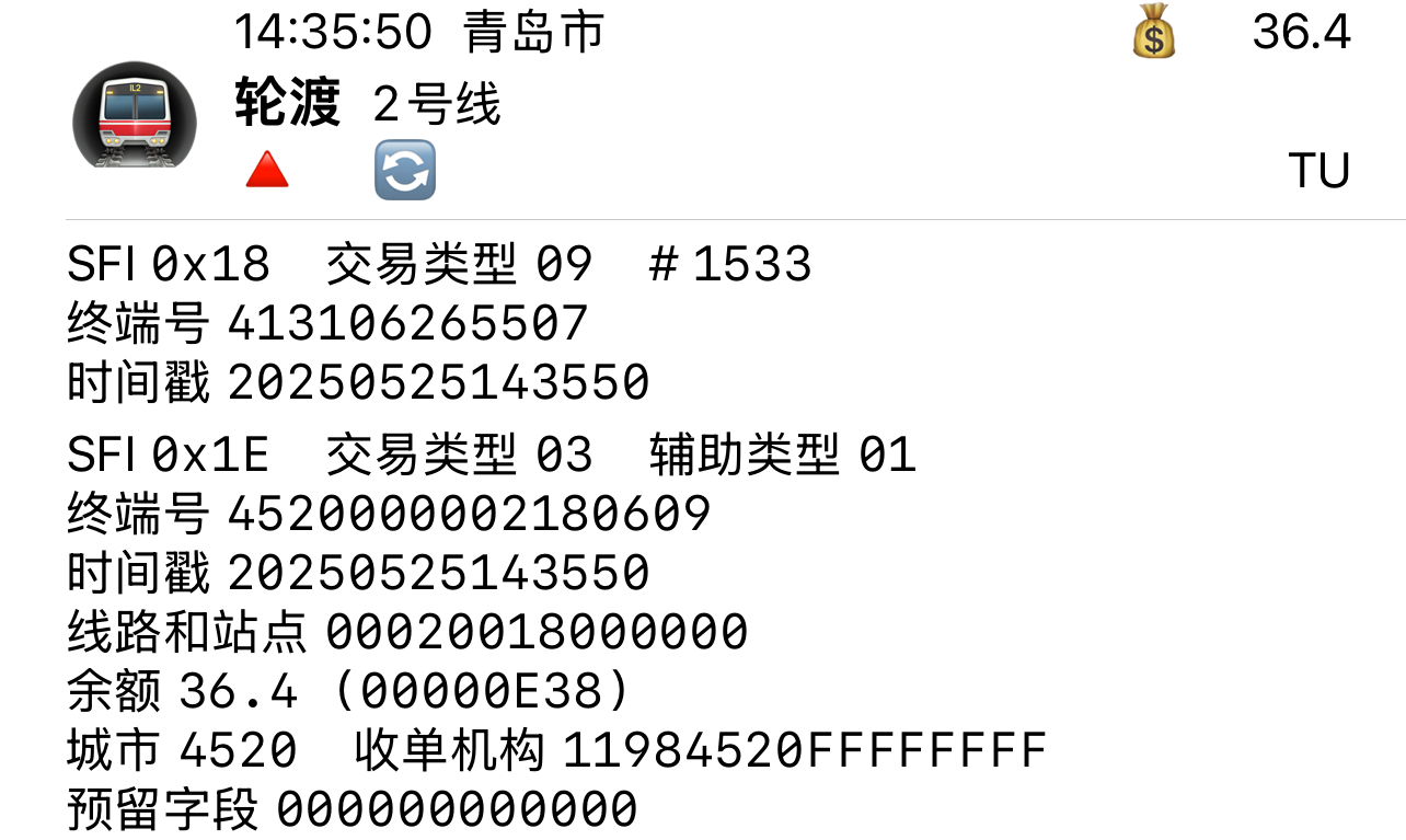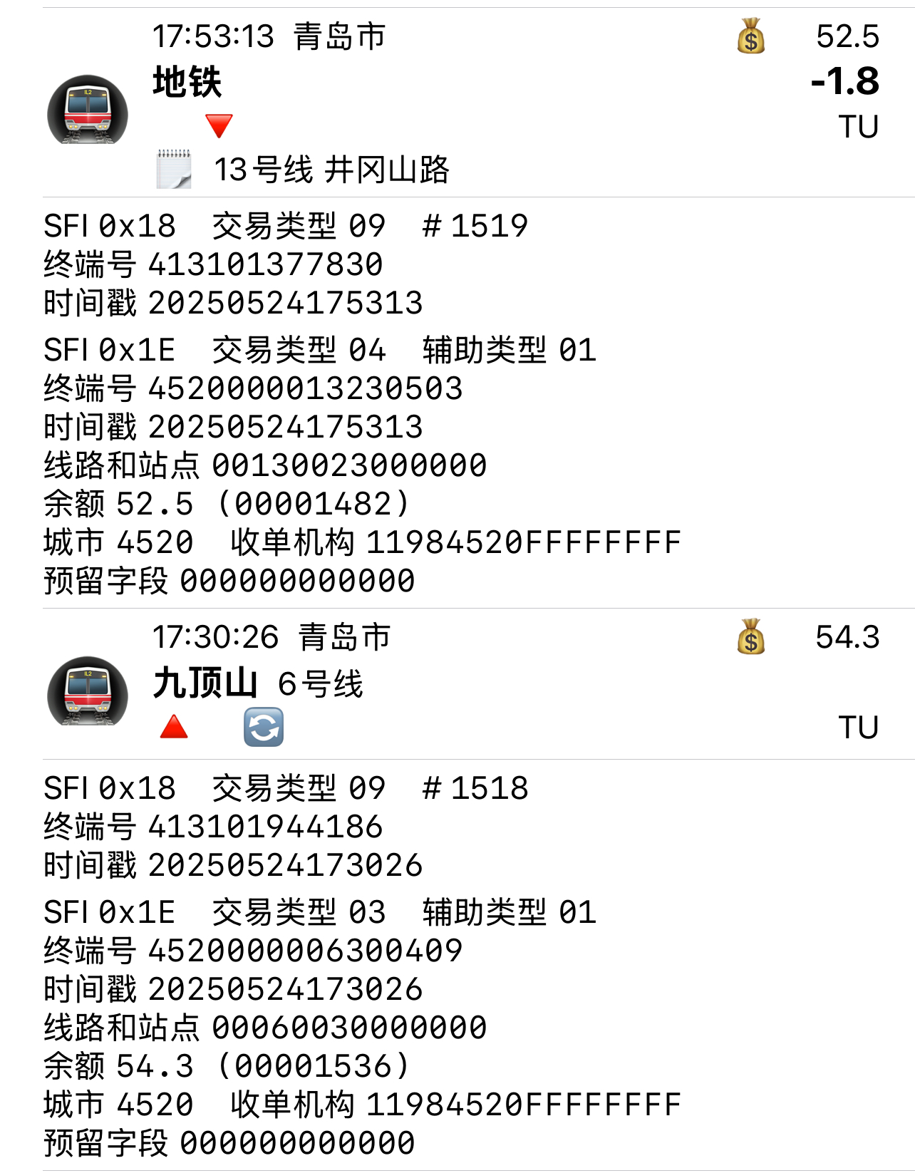 | Description | 自2025年3月青岛地铁可刷Apple Pay琴岛通卡后,青岛地铁所有线路TU交易中交易类型、1E终端号与线路与站点写法均已统一。过往13号线闸机交易类型写08,3、6、8号线闸机辅助类型写02等问题均已修正。 | ||||